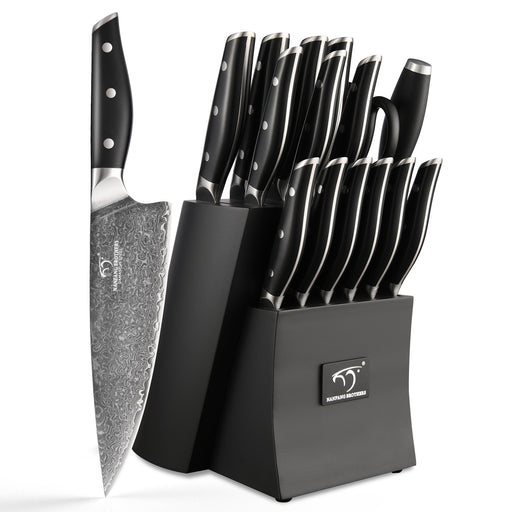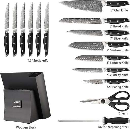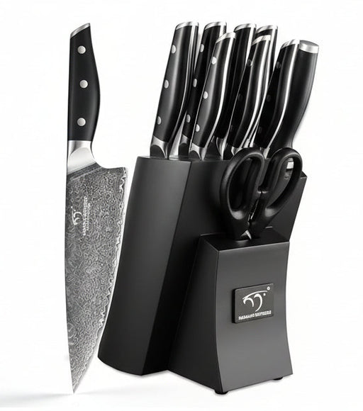 PROFESSIONAL JAPANESE STYLE - The knife block set consists of a VG-10 steel core with 67 layers and superior Damascus steel blades for precision...