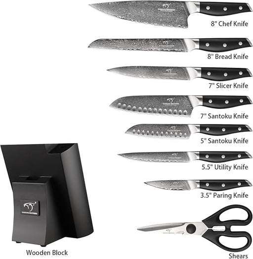 VALUE SET - Damascus Steel Knives include an 8" Chef Knife, 8" Slicing Knife, 8" Bread Knife, 7" Santoku Knife, 5.5" Utility Knife, 3.5" Paring ...